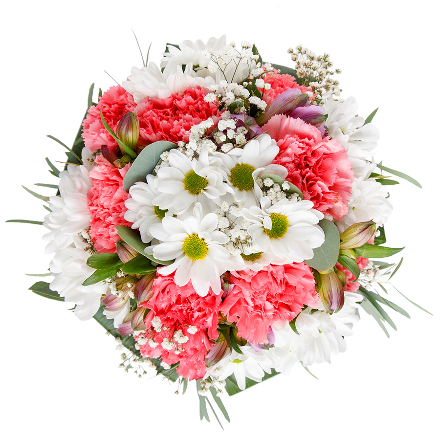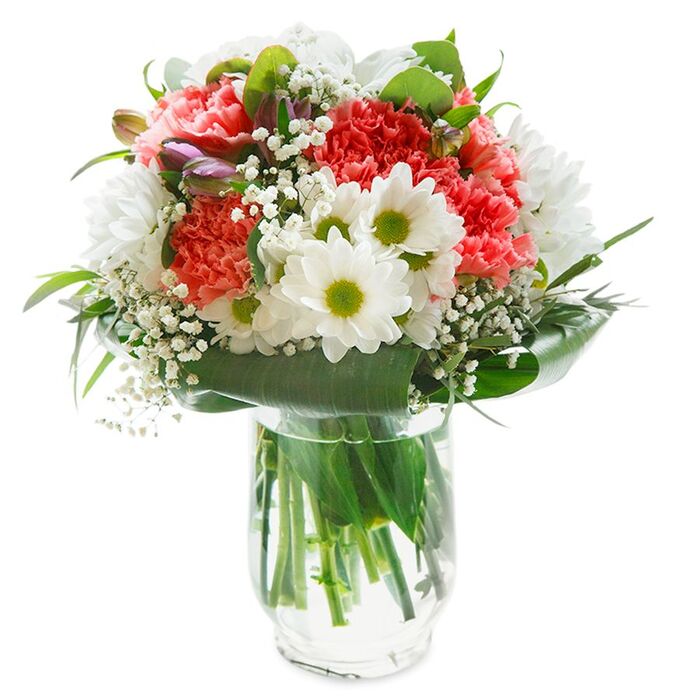 Experience the beauty and uniqueness of our exquisite seasonal arrangement. This stunning bouquet features a harmonious blend of snow-white chrysanthemums, delicate gypsophila, soft pink carnations, and lush aspidistra leaves, all meticulously hand-selected for their freshness.